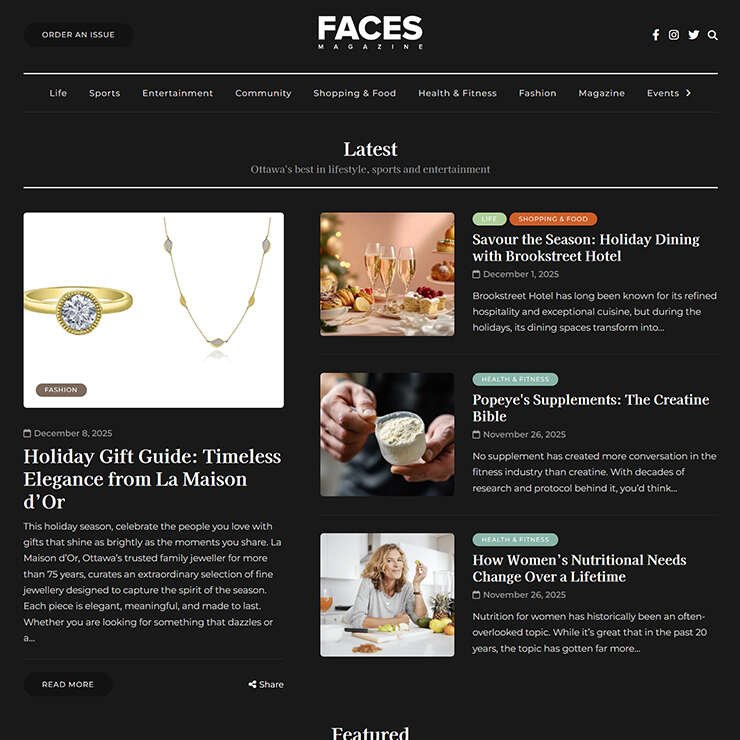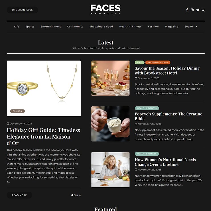 T he client is a Ottawa’s premier magazine, with monthly publication, that showcases the people, places and events that make Ottawa such a world-class city. Faces Magazine is primarily a lifestyle magazine with content focused on fashion, health, fitness, style and sports/entertainment. Faces is proud to be 100% Ottawa owned and operated since 2010.